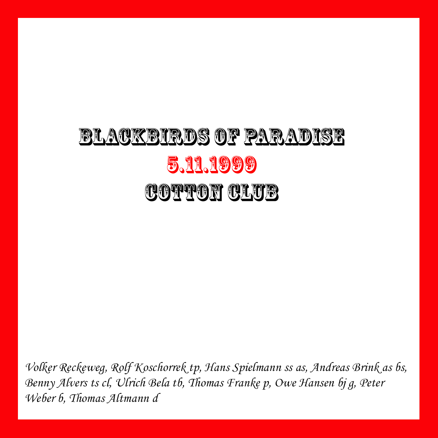 ![]() | Blackbirds Of Paradise | Im Cotton Club 1999-11-05 | 2 | MD | J010788 | Not On Label | Privataufnahme K.P. | |