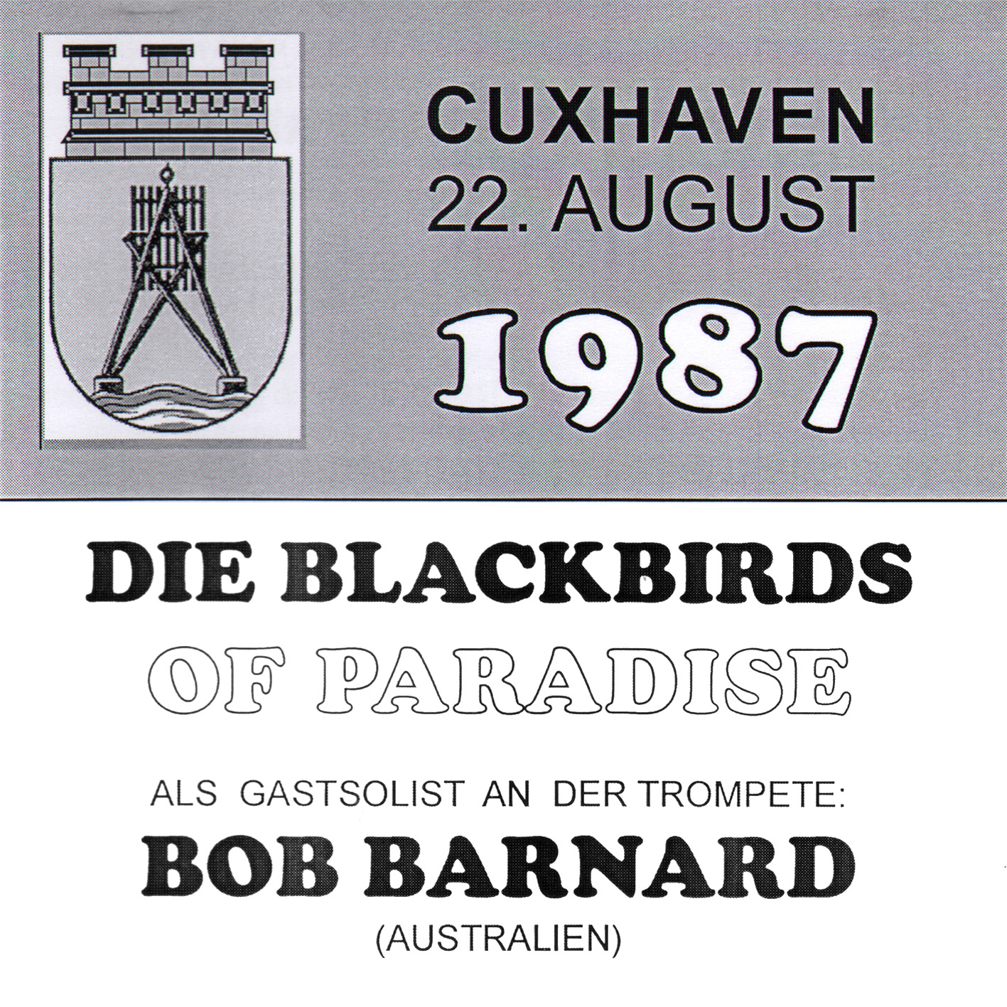 ![]() | Blackbirds Of Paradise | Blackbirds Of Paradise in Cuxhaven 22.8.1987 | 1 | CD | J007718 | Blackbirds Of Paradise | ||