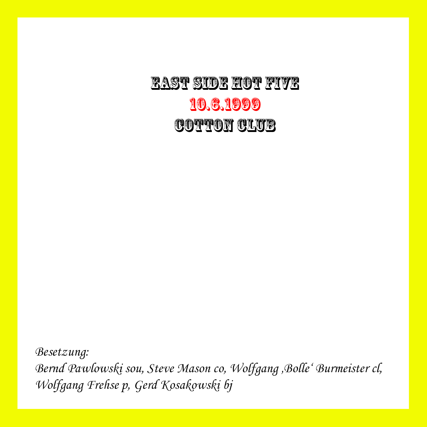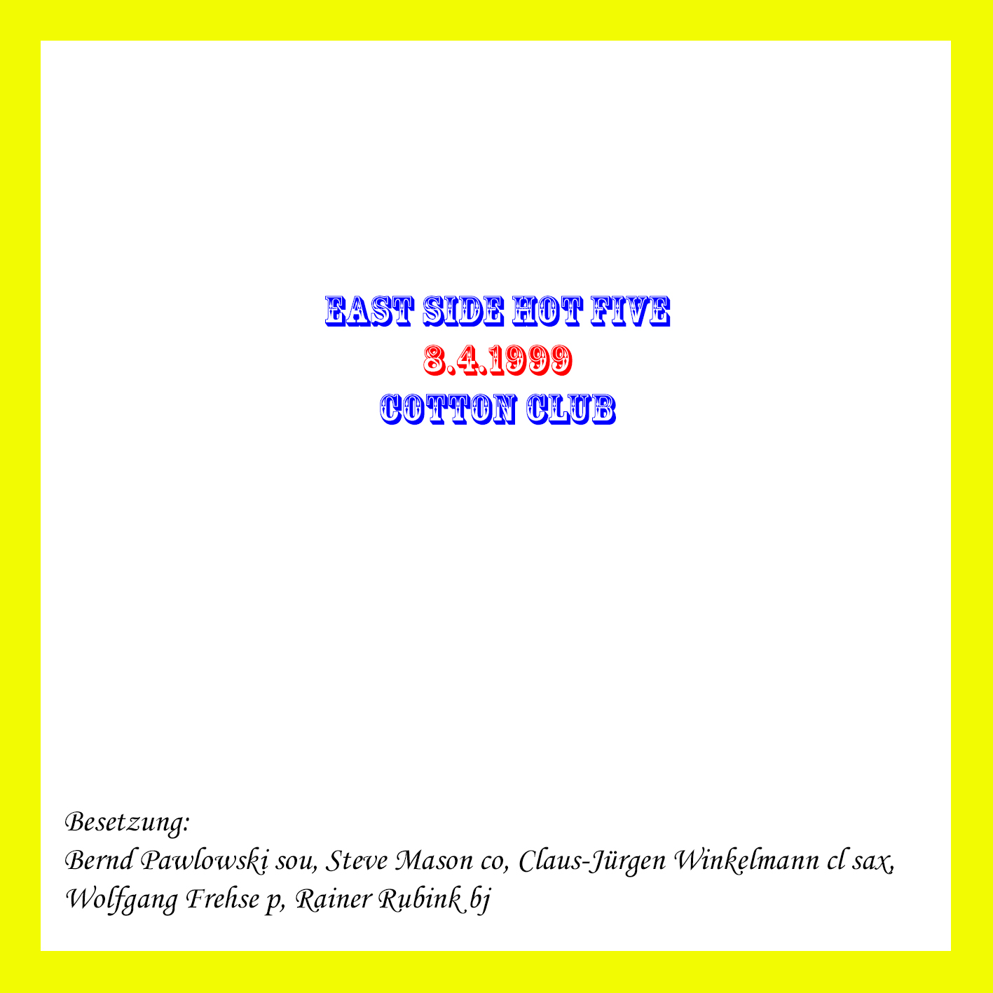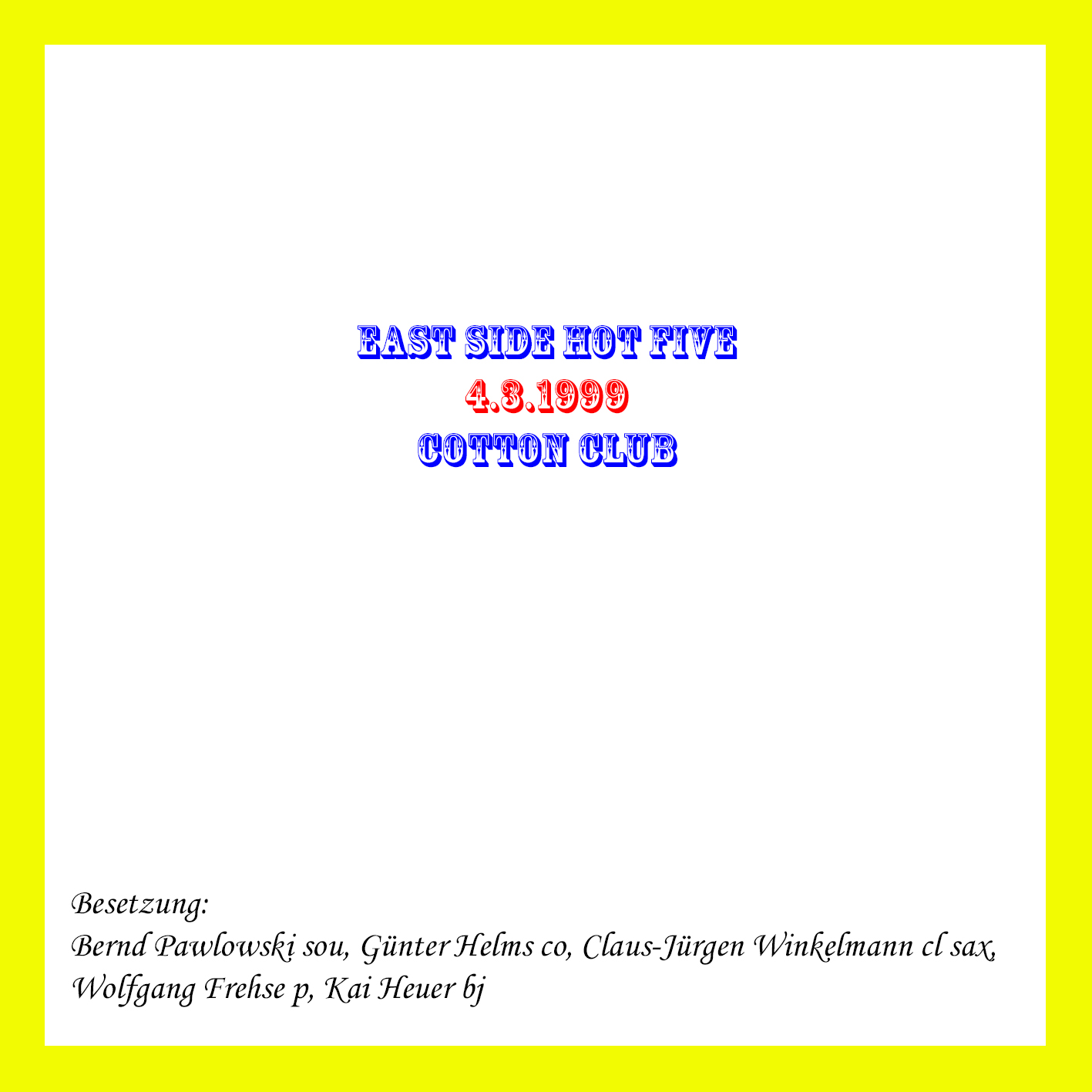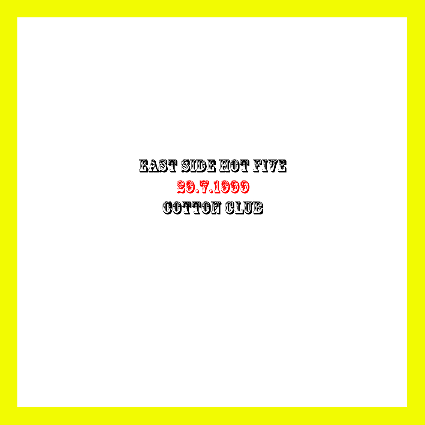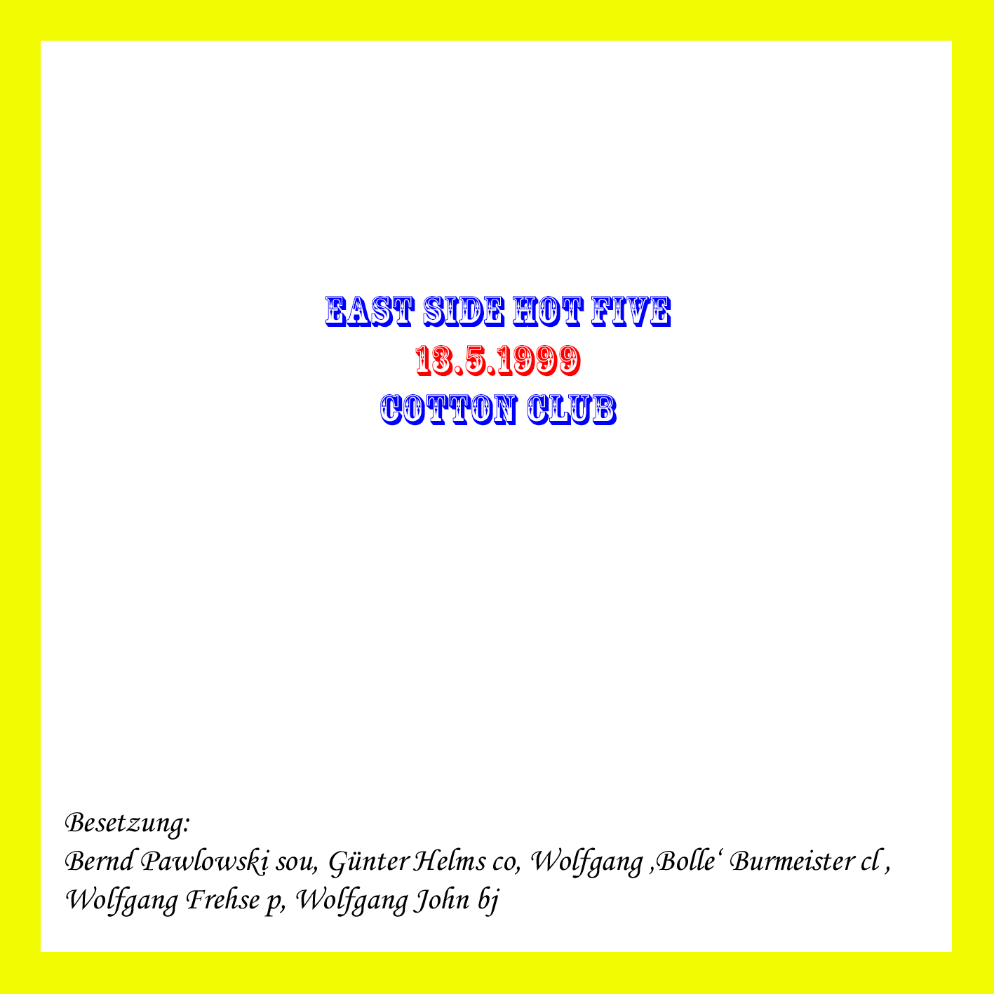 ![]() | East Side Hot Five | Im Cotton Club 1999-09-02 | 2 | MD | J010775 | Not On Label | Privataufnahme K.P. | |
