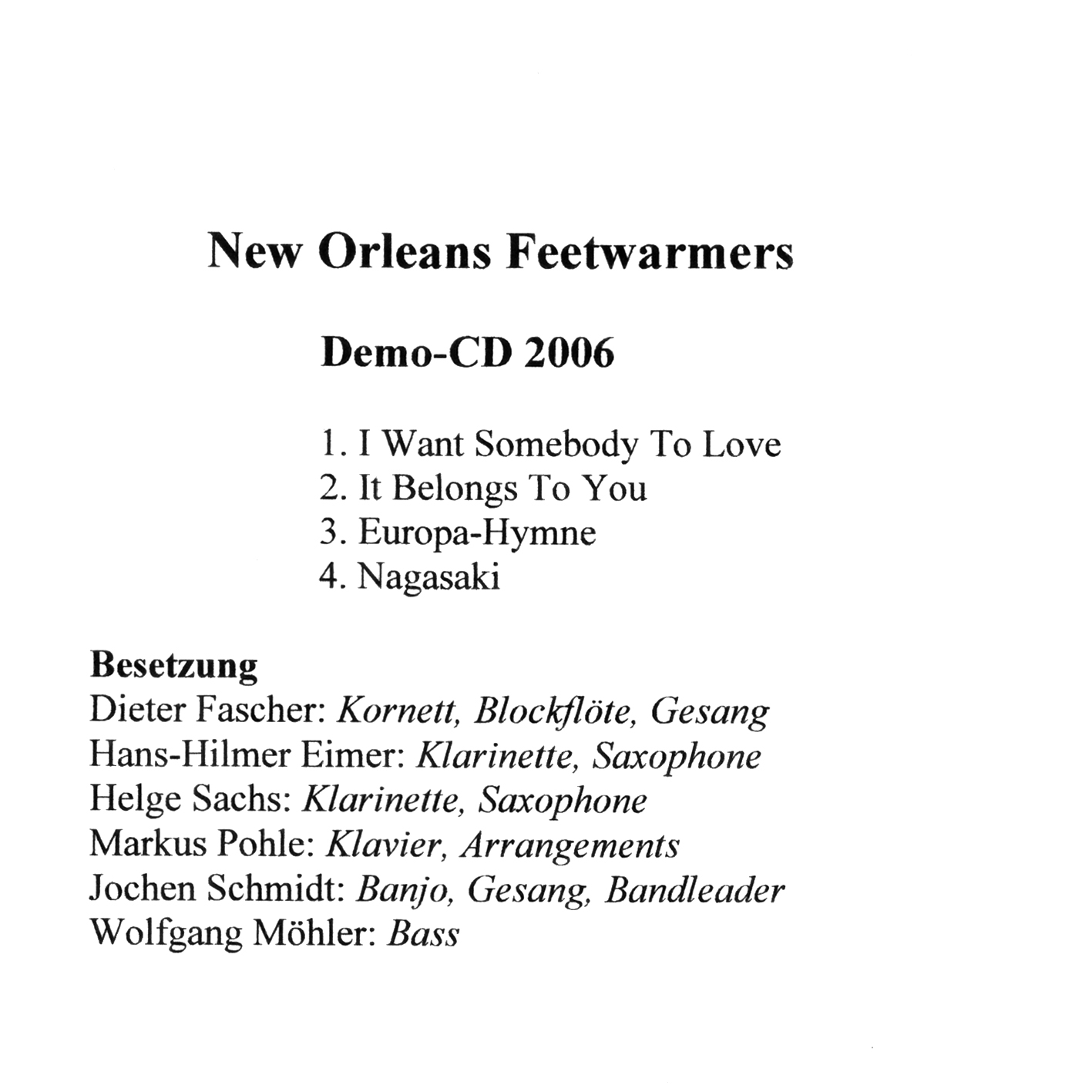 ![]() | New Orleans Feetwarmers | DEMO CD 2006 | 1 | CD | J009191 | Not On Label |