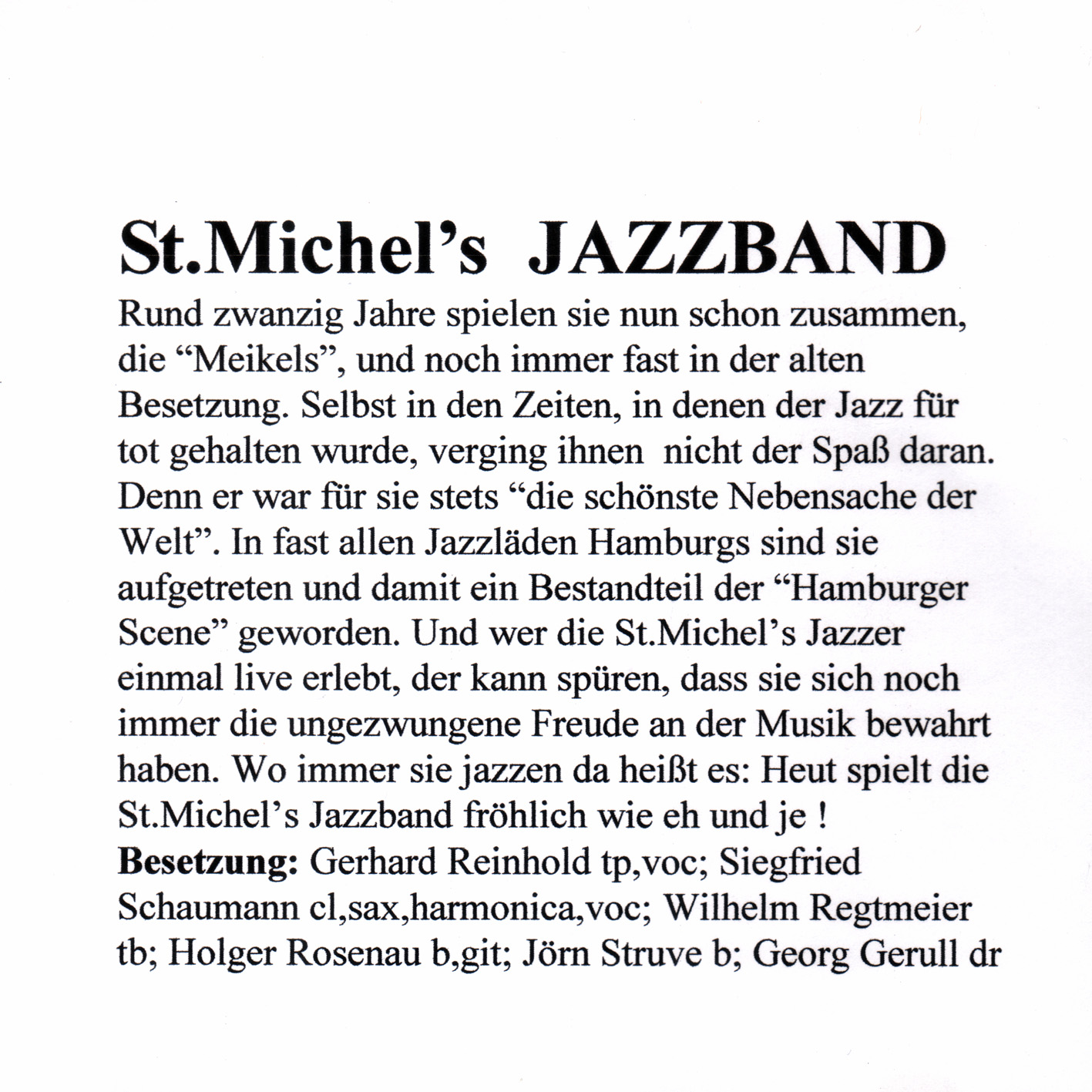 Trompete ( Gerhard Reinhold ), Klarinette ( Siegfried Schaumann ), Saxofon ( Siegfried Schaumann ), Klavier ( Gerhard Reinhold ), Bass ( Jörn Struve, Holger Rosenau ), Posaune ( Wilhelm D Regtmeier, Wolfgang Ahlers, Detlef Staack, Gerhard Reinhold ), Mundharmonika ( Siegfried Schaumann ), Schlagzeug ( Georg Gerull ), Gitarre ( Holger Rosenau ), Gesang ( Gerhard Reinhold, Siegfried Schaumann )