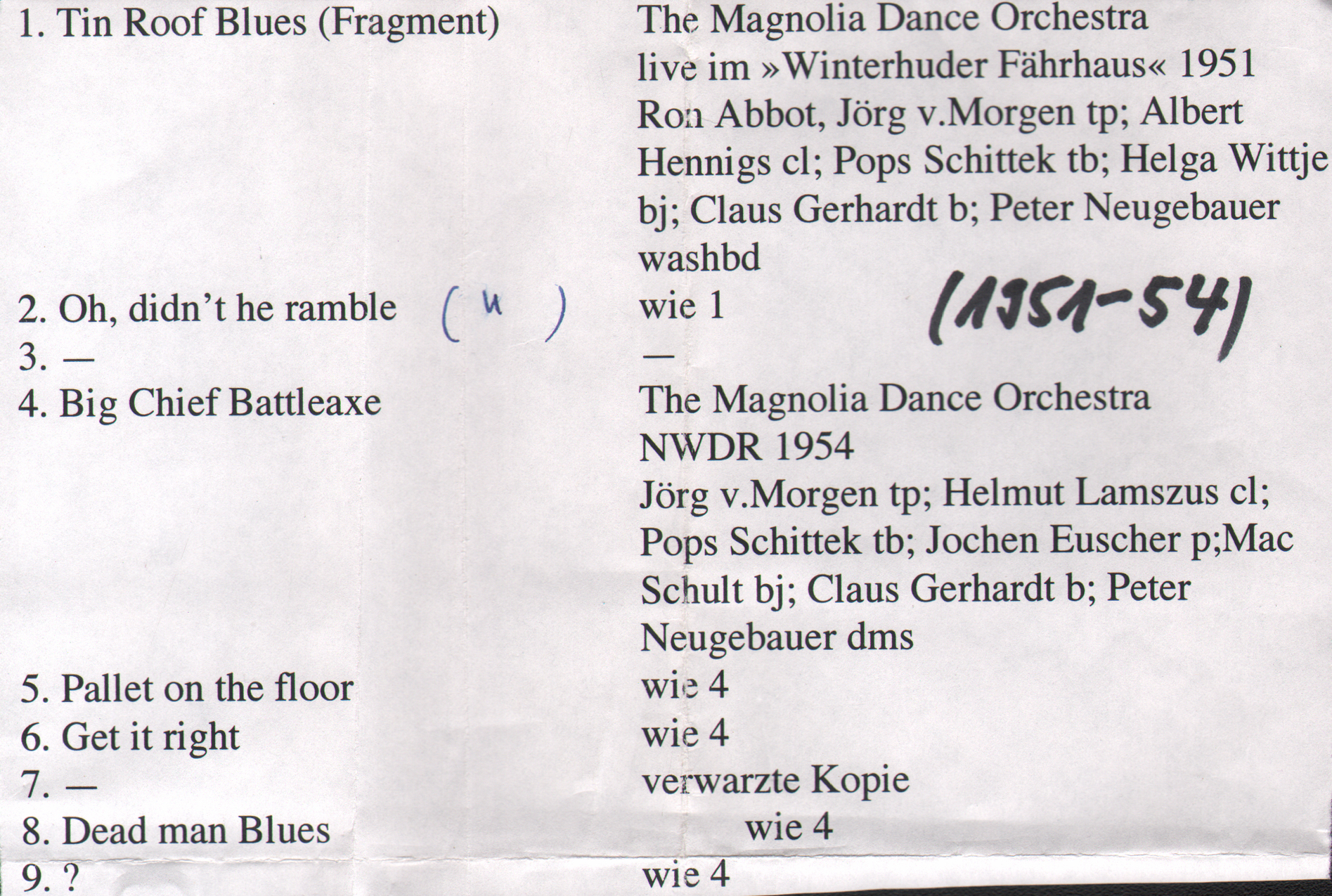 Trompete ( Jörg von Morgen ), Klarinette ( Helmut Lamszus, Albert Hennings ), Klavier ( Jochen Euscher, Con Rich, Hermann Hausmann, Rudi Werner ), Bass ( Klaus Gerhardt, Olaf Lamszus ), Banjo ( Helga Witte, Mac Schult ), Posaune ( Gerd Pops Schittek ), Schlagzeug ( Peter Neugebauer, Arnim Silwar ), Gitarre ( Mac Schult )